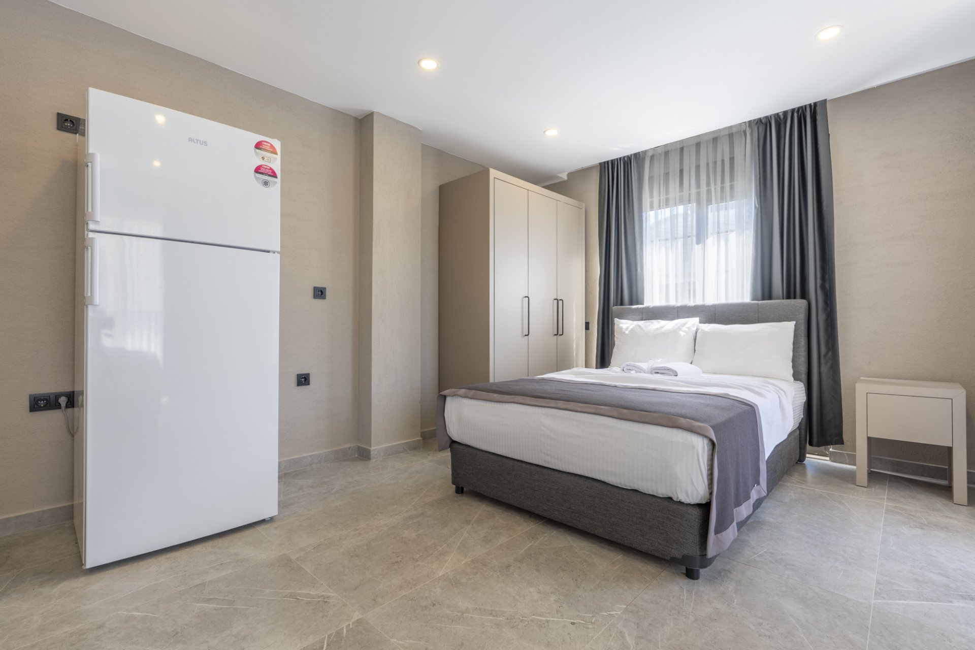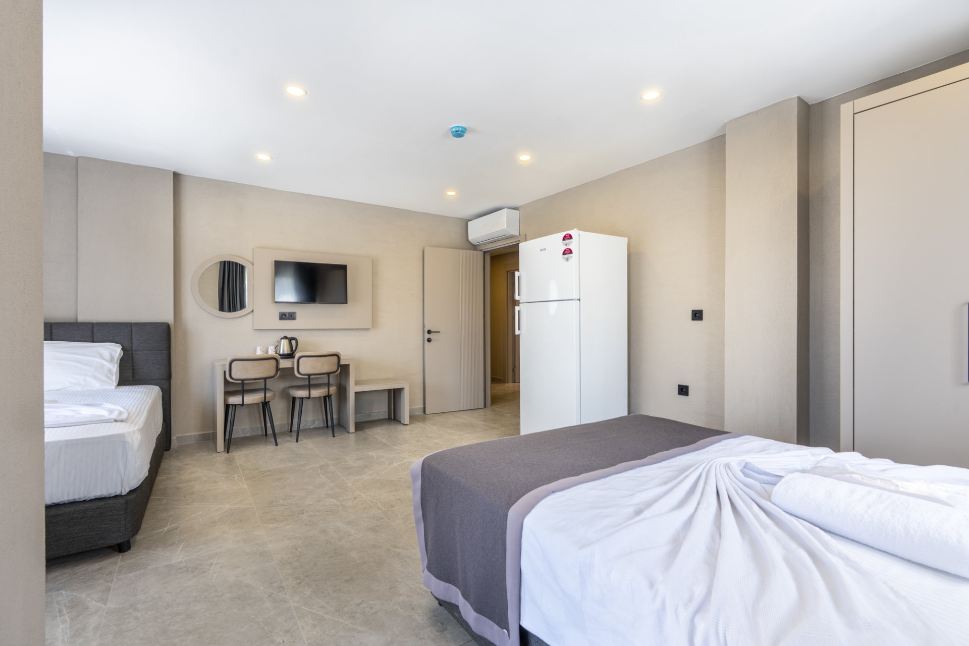 "Büyük Gruplar İçin Maksimum Kapasite" Tesisimizin en yüksek konaklama kapasitesine sahip olan bu ara kapılı odalarımız, kalabalık aileler ve büyük arkadaş grupları için özel olarak tasarlanmıştır. Mutfak gereçlerinden bağımsız, standart otel konforunu büyük bir grupla bir arada yaşamak isteyen misafirlerimizi ağırlamak için tasarlanmıştır. Maksimum 7 kişi konaklama kapasitesine sahip odalarımızda 3 Çift Kişilik (Double) yatak ve 1 Tek Kişilik (Single) yatak, Klima, LCD TV ve Modern Banyo bulunmaktadır.